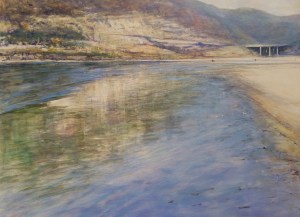 Cuadro Playa de Oriñon donde los reflejos de la montaña adyacente, macizo Cerredo, y puente sobre la desembocadura del río Agüera son protagonistas
